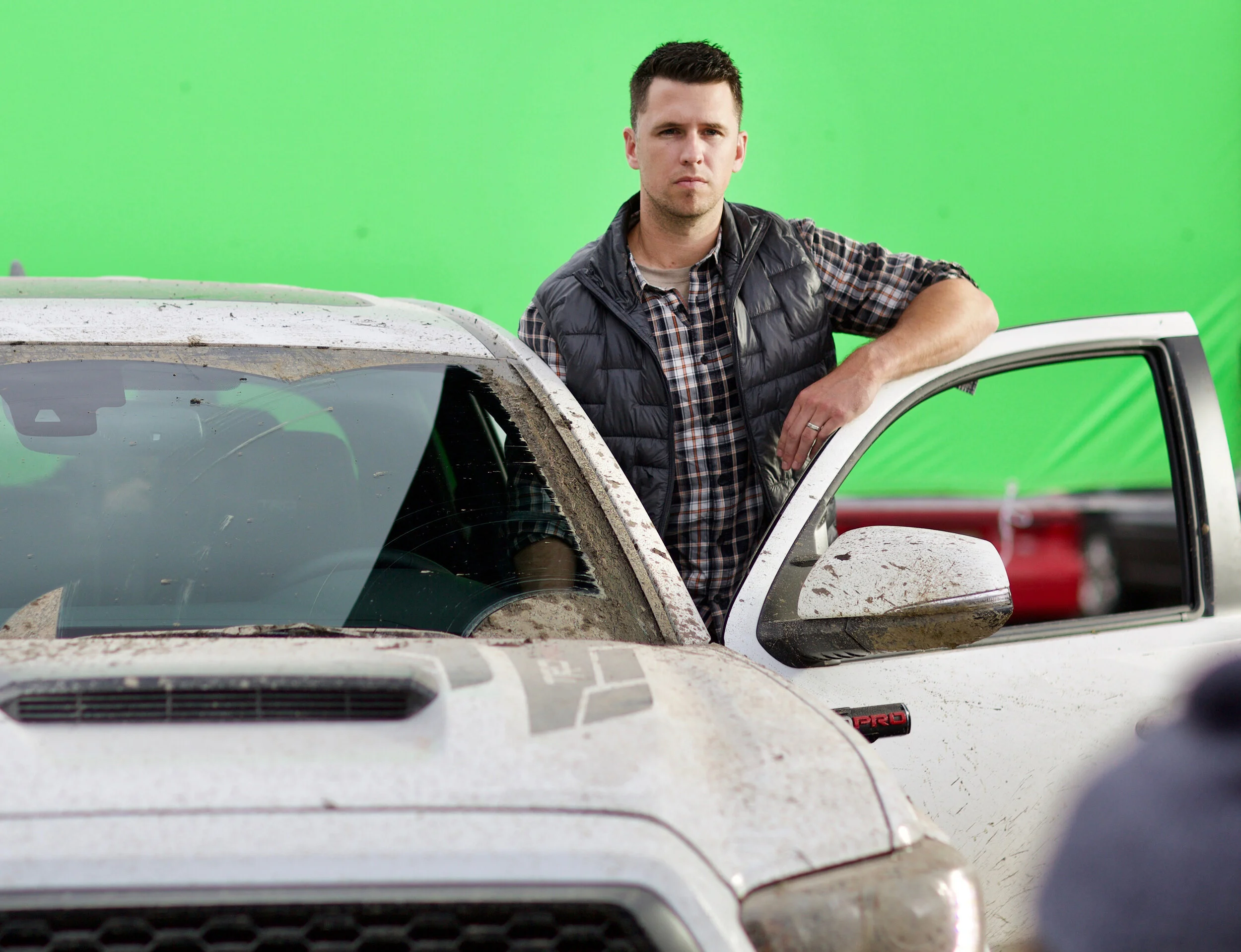 A man wearing a checkered shirt and black vest stands in a white dirty pickup truck, gesturing with his right hand. The truck has mud splatters and the setting appears to be a film or video production with a green screen in the background and a boom
